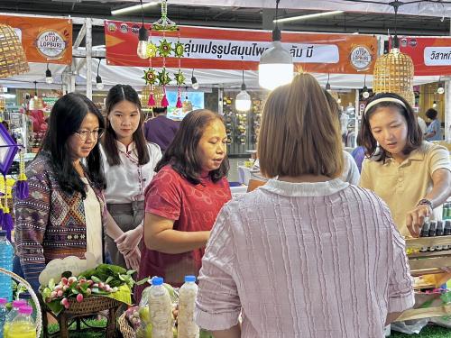 ✨นางวรรณวรัทย์ คำปนารถ พัฒนาการอำเภอหนองม่วง พร้อมด้วยเจ้าหน้าที่พัฒนาชุมชนอำเภอหนองม่วง ร่วมเยี่ยมชม ให้กำลังใจ และสนับสนุนผู้ประกอบการในโครงการยกระดับสินค้าของฝาก ของที่ระลึก ให้มีเอกลักษณ์โดดเด่น แสดงอัตลักษณ์ของแหล่งท่องเที่ยวต่างๆ กิจกรรมส่งเสริมการตลาดผลิตภัณฑ์ชุมชนจังหวัดลพบุรี ซึ่งจัดขึ้นโดยความร่วมมือระหว่างสำนักงานพัฒนาชุมชนจังหวัดลพบุรี คณะกรรมการเครือข่ายกลุ่มอาชีพ และผู้ผลิต ผู้ประกอบการ OTOP จังหวัดลพบุรี