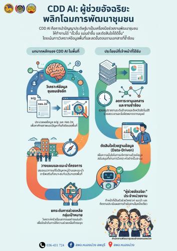 CDD AI คือ เว็บไซต์และแพลตฟอร์มผู้ช่วยพัฒนากรที่ใช้เทคโนโลยีปัญญาประดิษฐ์ (AI) รวบรวมข้อมูล เครื่องมือ และสารสนเทศสำคัญด้านการพัฒนาชุมชนไว้ในที่เดียว ช่วยให้พัฒนากร ผู้บริหารและประชาชนเข้าถึงข้อมูลที่จำเป็นได้ง่ายขึ้น พร้อมสามารถวิเคราะห์สถานการณ์ชุมชน วางแผนการพัฒนาได้อย่างรวดเร็ว แม่นยำ และมีประสิทธิภาพ